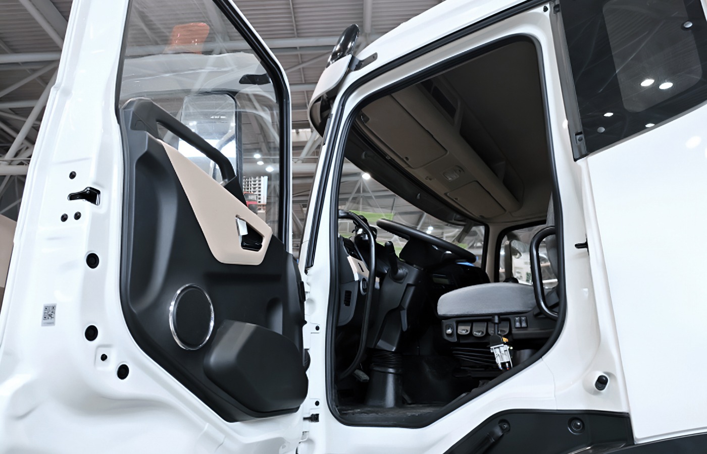 Кабина самосвала просторная и рассчитана на длительную работу. Интерьер выполнен в двухцветной гамме: светло-жёлтый верх и чёрный низ. В стандартное оснащение входят: